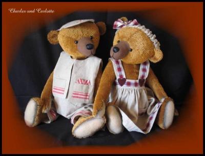 Charles and Charlotte are each 52 inches tall stuffed mohair, with fiberfill, with shoe button eyes, loose jointed, nose waxed, airbrushed accents. Dressed in linen dress or suit. Prefer to stay together, they want to, maybe you will find a new home together?