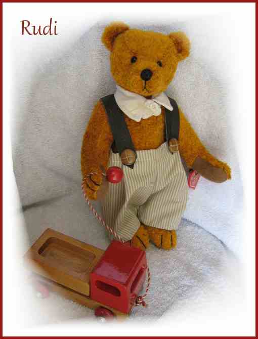 Rudi Schulte is made of viscose. He is 32cm tall and has 5 joints. He is stuffed with fiberfill and his nose slightly waxed. He wears a hand-made leather pants with suspenders and a self-stitched linen collar. Its wood with a car that Rudi, of course!