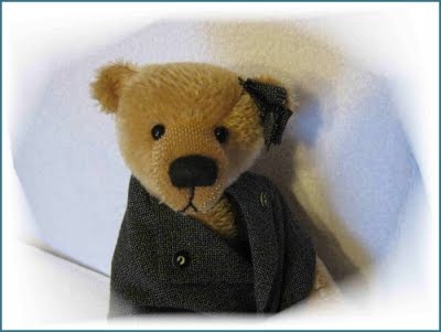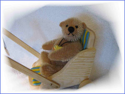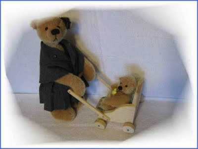 mother and child are 38 and 17 cm tall and made of light beige Plummer Schulte mohair. Pride drives the mother her child in a handmade wooden handcart spazieren.Sie is a gray pleated skirt covered with shawl. The child sits in a wooden cart. Both are filled with fiberfill and pellets.