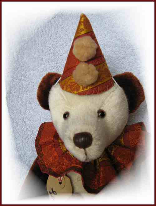 long-Ling was made of self-colored mohair. He is 5 way jointed and stuffed with fiberfill. His stitched nose is slightly waxed. He wears a hat and a collar of old shelves.